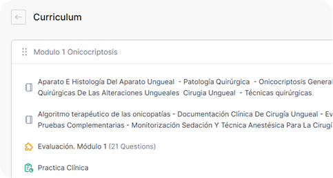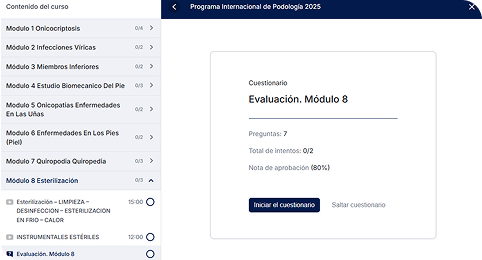 Recibe acompañamiento directo de la formación internacional de podología durante el desarrollo de los módulos, cada módulo tiene una evolución donde se evalúa el conocimiento aprendido de ese módulo y adicional a esto estamos creando una comunidad en caso de que se quiera consultar, si hay un paciente diferente que no se pueda manejar.